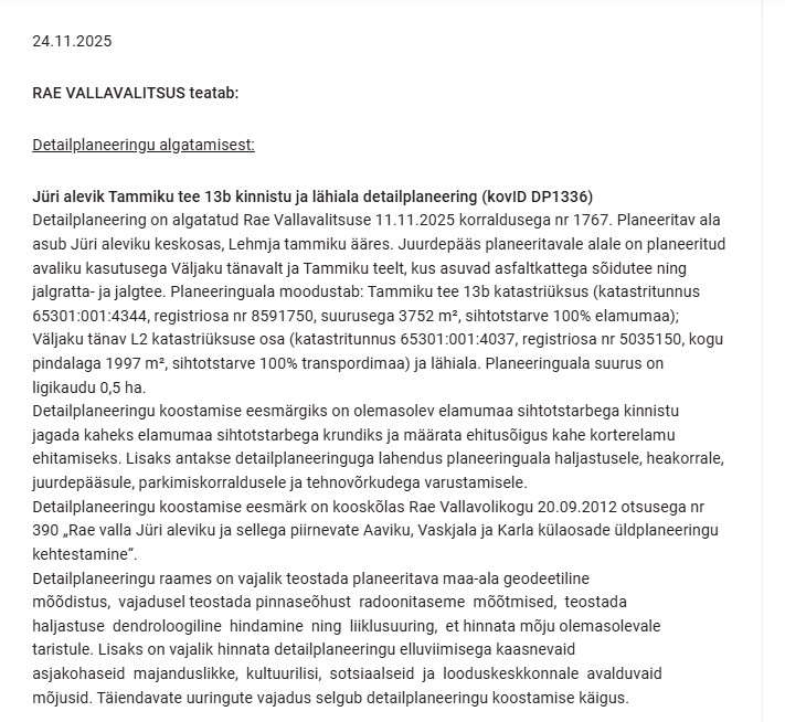 [To Parent Directory]11/25/2025 2:48 PM 2450229 DP1336 _Jüri alevik Tammiku tee 13b kinnistu dp algatamine_HE_21.11.2025.pdf11/25/2025 9:25 AM 145370 DP1336_Jüri alevik Tammiku tee 13b kinnistu dp algatamine_Rae valla koduleht_24.11.2025.jpg