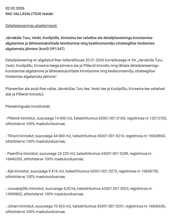 2/5/2026 11:09 AM 100110 DP1347 Turu, Veski jt kinnistute dp algatamine ja KSH algatamata jätmine_nr 1 teade_Rae valla koduleht_02.02.2026.jpg